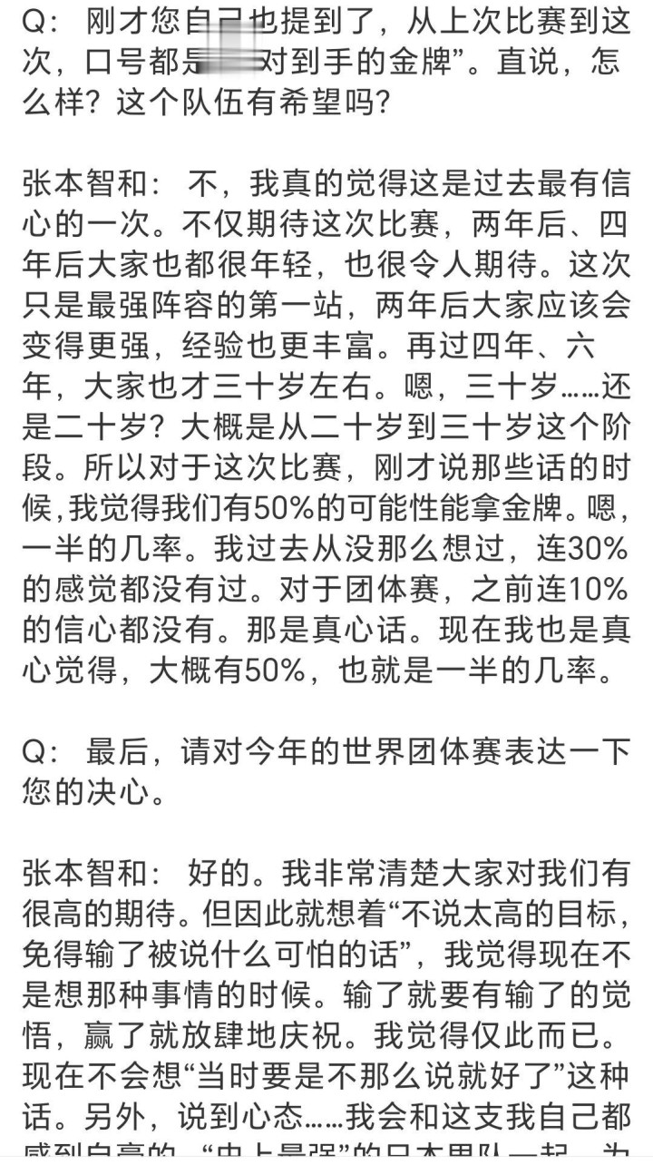队伍中除了他我方以外,还有松岛辉空这一位顶尖选手,因此这让张本智和关于这一次伦敦世乒赛充满了信心。